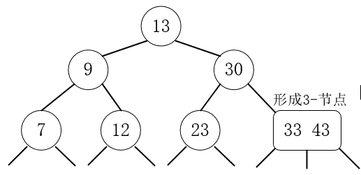 8、插入33,33大于13,33大于30,33小于43,与43融合成3节点