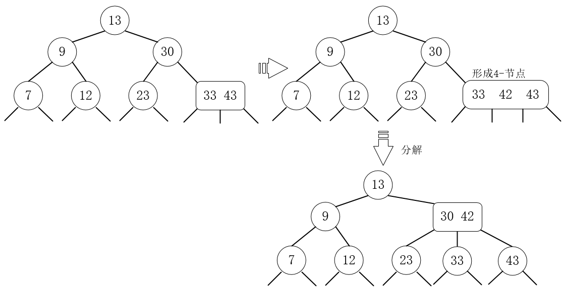 7、插入9,9小于13,9大于7,9小于12,与(7 12)融合成4节点,然后分解。分解后9升级到上一层,与(13 30)融合成4节点,再次分解