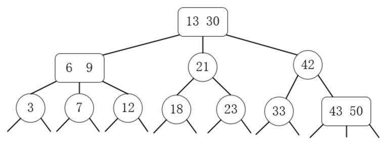 2-3树的意思就是说,一个父节点可以有两个子结点,也可以有三个子结点,并且其也满足类似二叉搜索树的定义(父结点的值大于左子树,但小于右子树),所有叶子节点都在同一层。