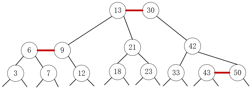 9、插入42,42大于13,42大于30,42大于33,42小于43,与(33 43)融合成4节点,然后分解