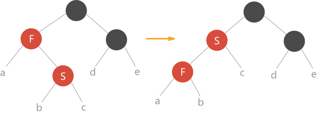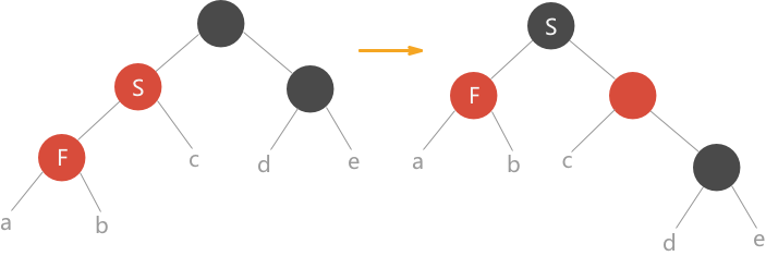 分析:在此种情况下,由于当前结点 F 和父结点 S 颜色都为红色,违背了红黑树的性质 4,此时可以将 S 颜色改为黑色,又违反了性质 5,因为所有通过 S 的路径其黑高度都增加了 1 ,所以需要将其祖父结点颜色设为红色后紧接一个右旋,这样这部分子树有成为了红黑树。(上图中的右图虽看似不是红黑树,但是只是整棵树的一部分,以 S 为根结点的子树一定是一棵红黑树)