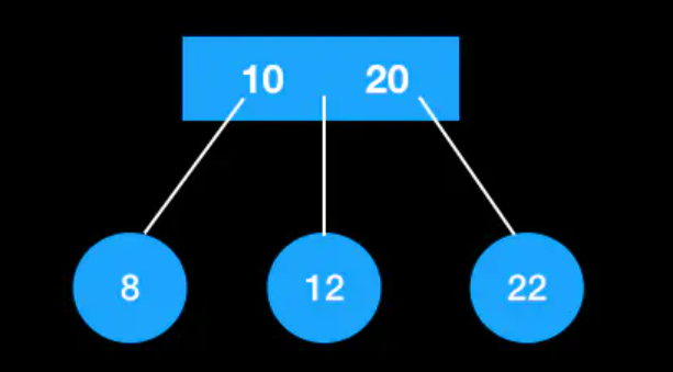 - 3节点:父亲节点存储两个值,最多有左中右三个子树。假设父节点分别为p1,p2,子节点分别为l(左节点)、m(中间节点)、r(右节点),且满足: