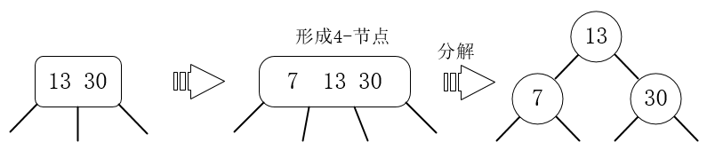 3、插入7,7比13小,融合成一个值为(7 13 30)的4节点,然后分解