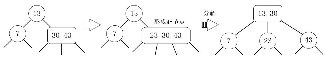 5、插入23,23大于13,23小于30,与(30 43)融合成4节点,然后分解